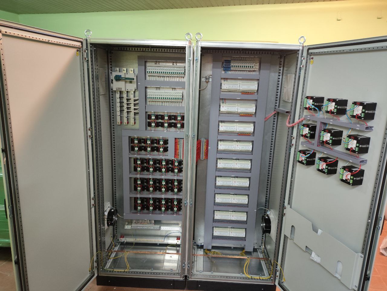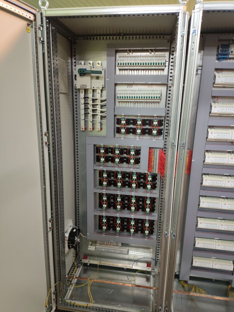 Основное назначение шкафов — контроль и регулировка температуры теплоносителя на испытательном стенде по 200 точкам.